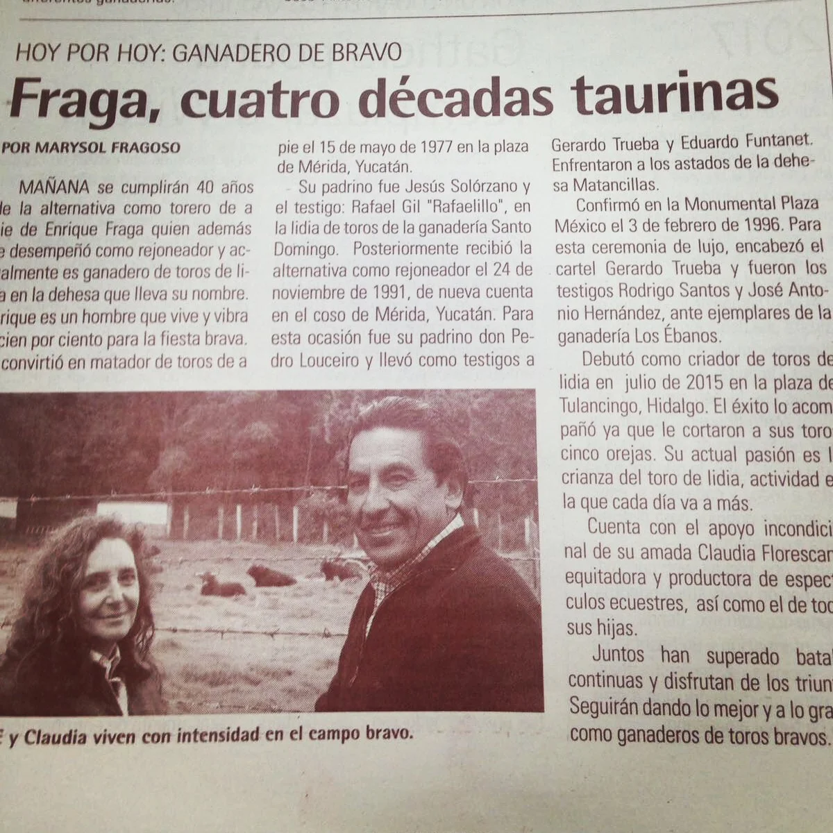 Diario Esto, mayo 14 de 2017.  Marysol Fragoso recuerda cuarenta años del Mat. Enrique Fraga  dedicados al toro bravo. Enhorabuena Maestro.
